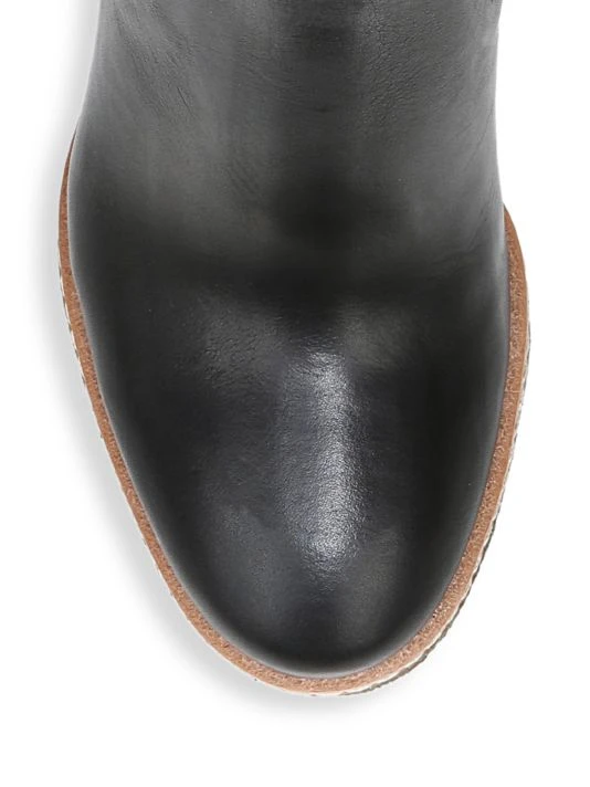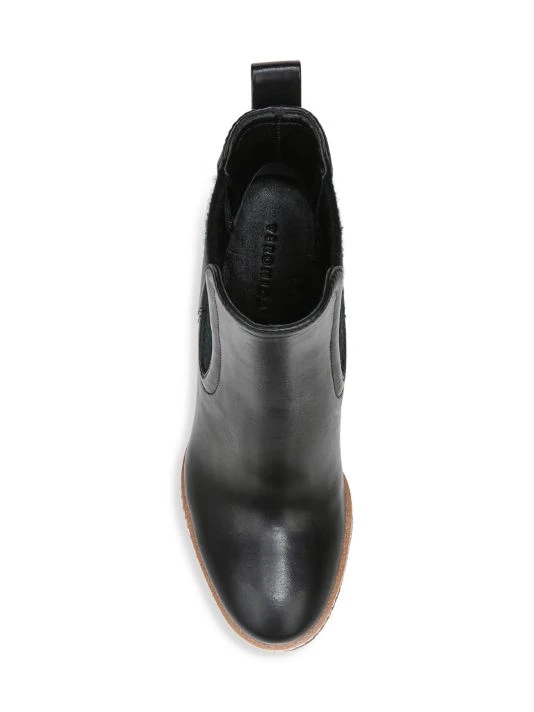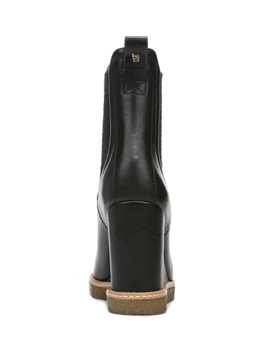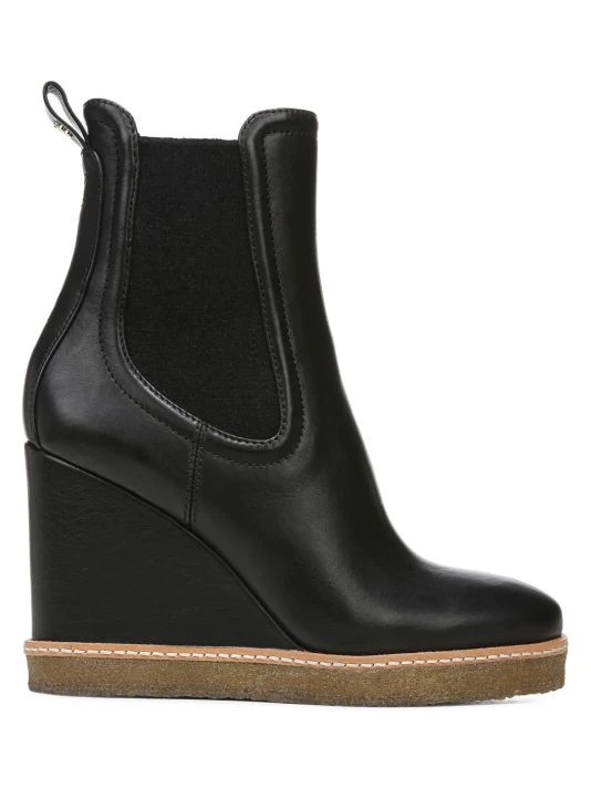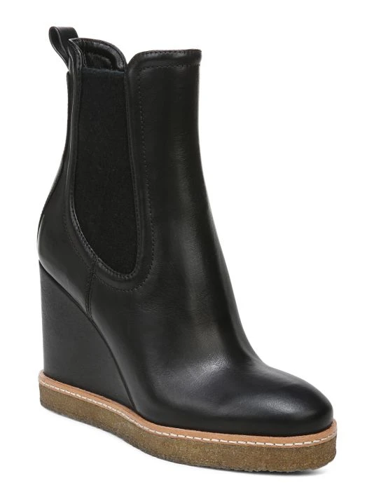 Smooth water-repellent leather ankle booties set upon a wedge heel with a contrasting sole.