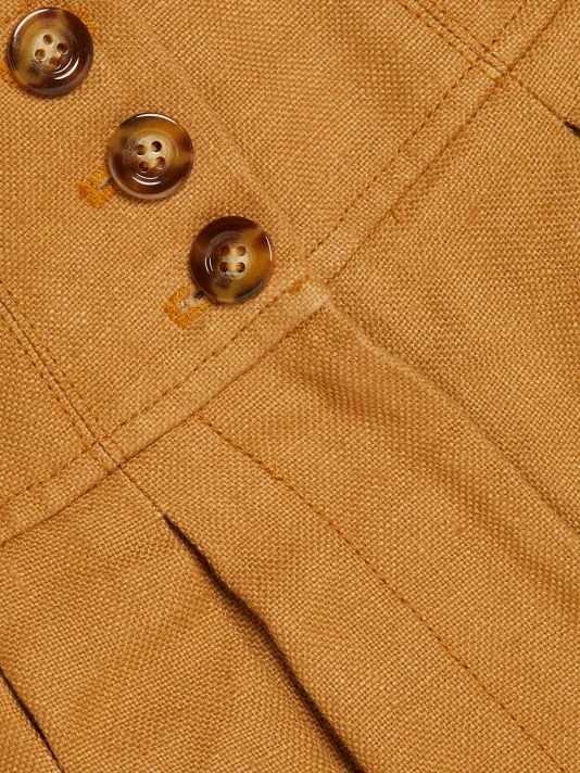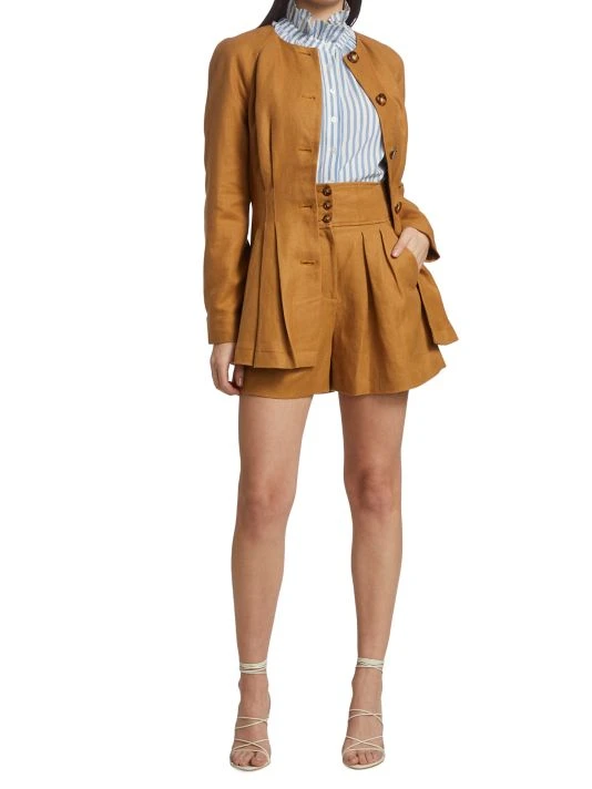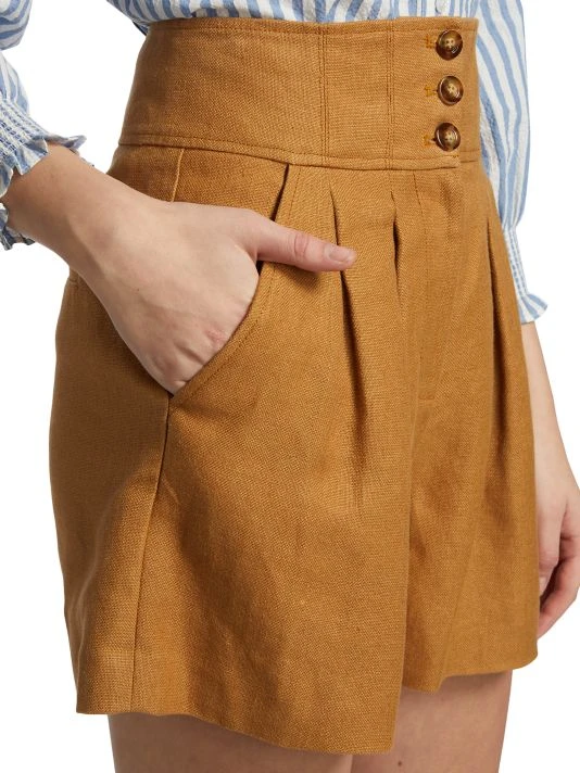 These high-waisted linen shorts features a banded waist with tortoiseshell buttons and tailored front pleats.