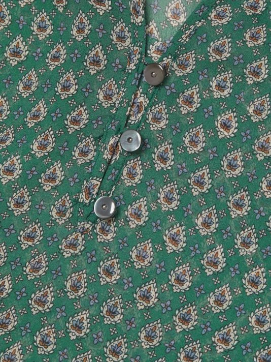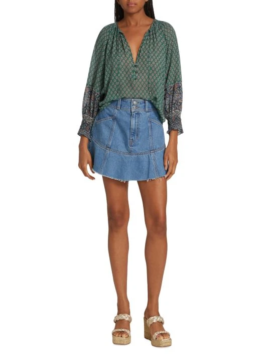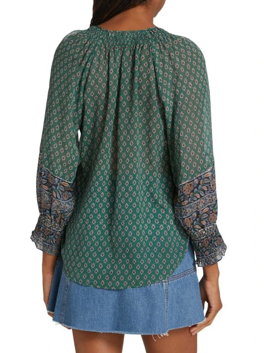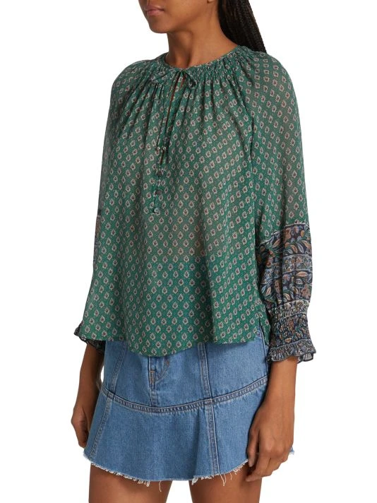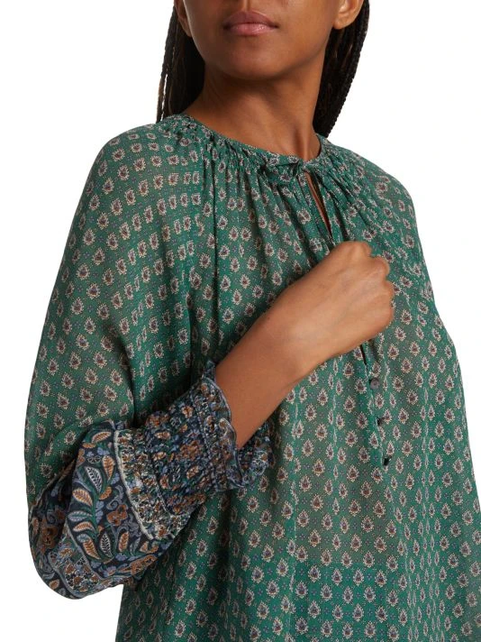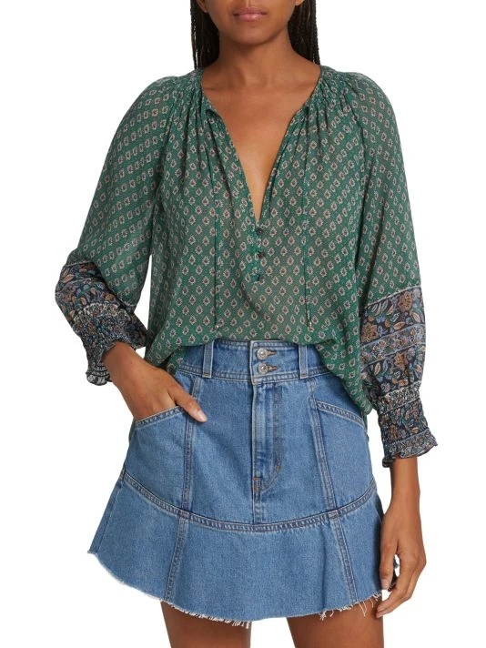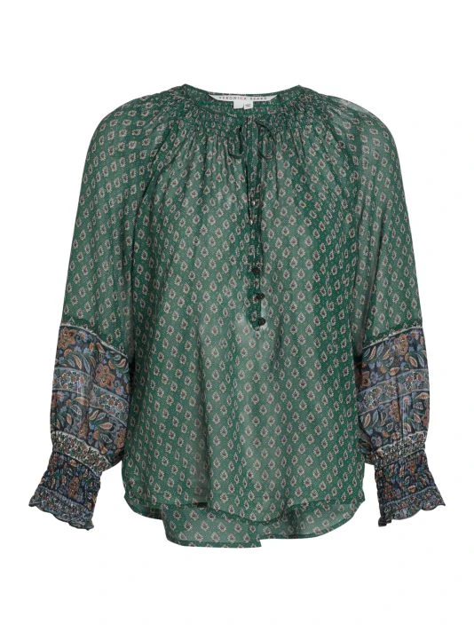 Veronica Beard’s Amato top is crafted of semi-sheer silk with a delicate paisley print.