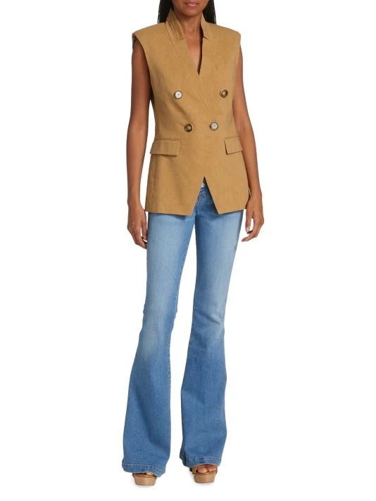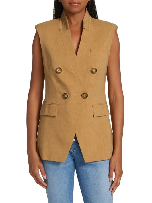 Veronica Beard’s Amika vest features a tailored silhouette with a sharp upcollar and structured padded shoulders. Tortoiseshell buttons and hip flap pockets finish this double-breasted style.