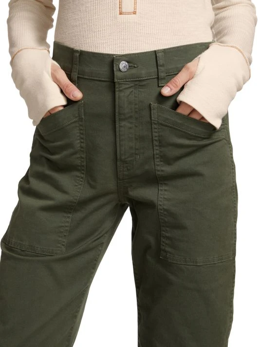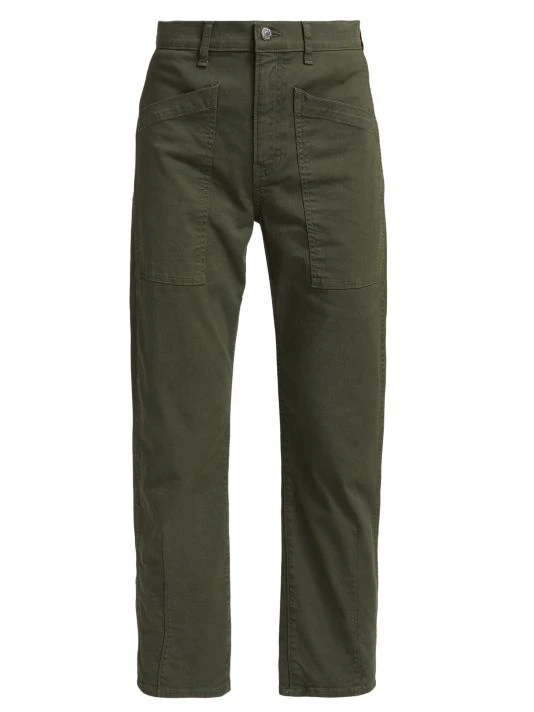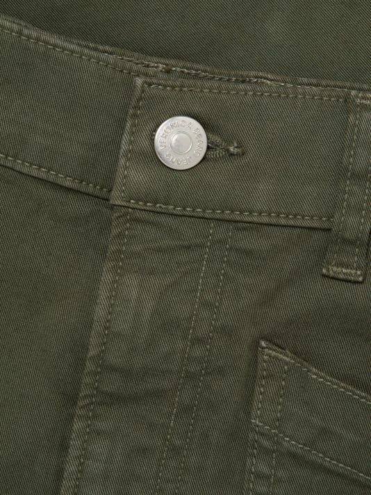These stretch-denim jeans feature a uniquely curved barrel-leg silhouette with four patch pockets, darted seams above the hems, and a cropped hem.