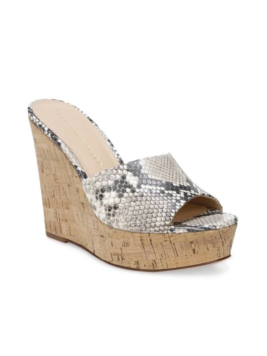 A cork midsole lends boho flair to these snake-embossed wedge sandals.