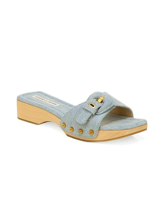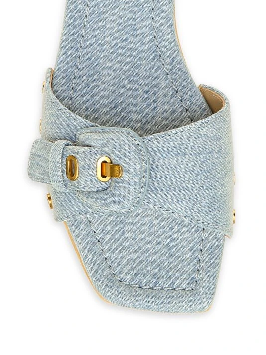 These denim clogs feature a buckle at the vamp, finished with goldtone studs.