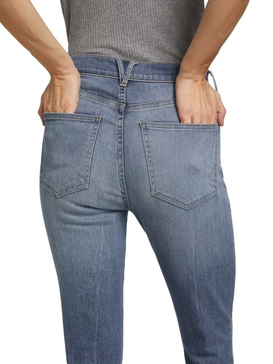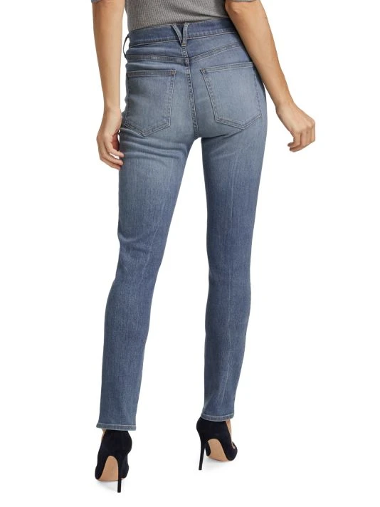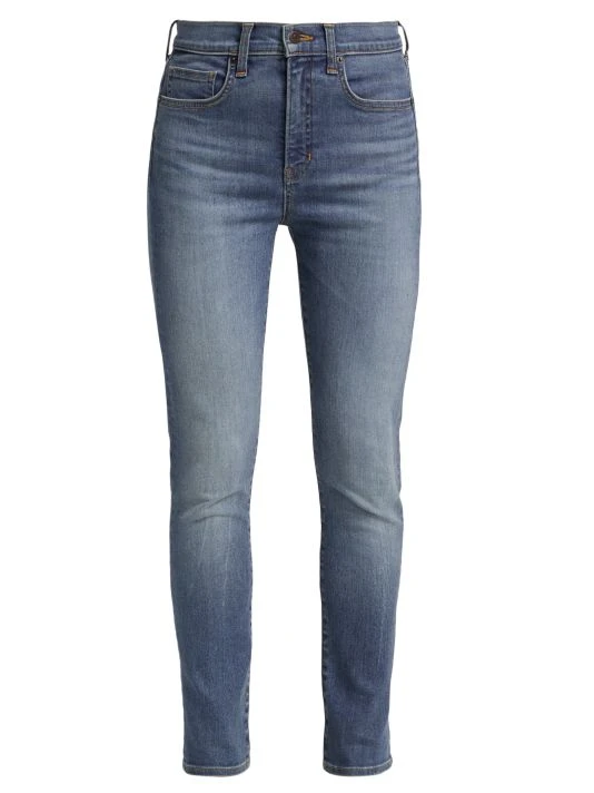 These stretch-denim jeans have a classic skinny silhouette with whiskering and slight fading along the legs.