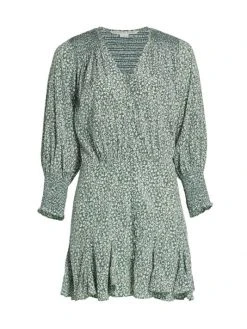 Veronica Beard’s Desio dress is made of floral-printed silk with voluminous billowed sleeves. Cut in a mini length, the piece is cinched with a smocked waistline that falls into a flared skirt.