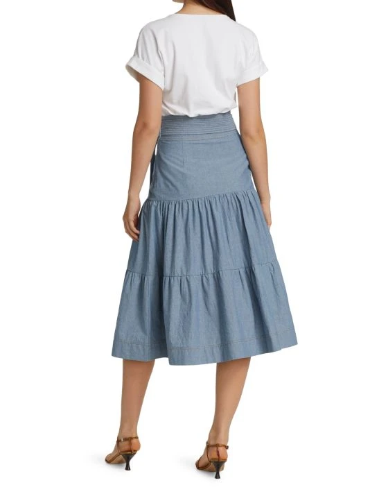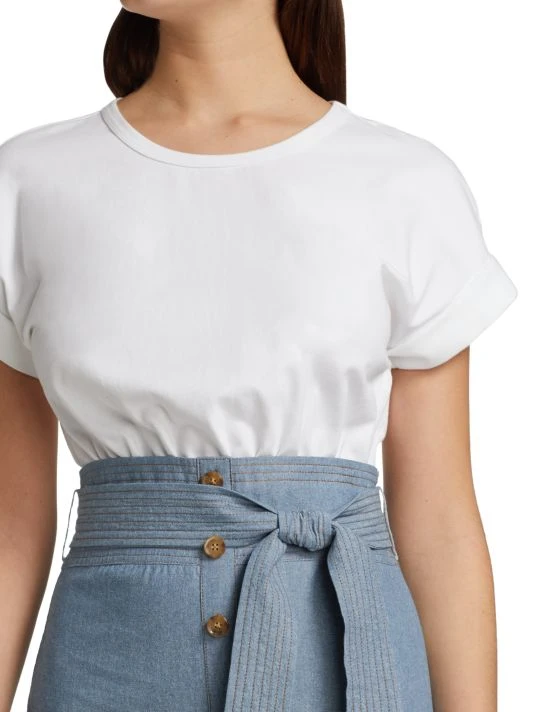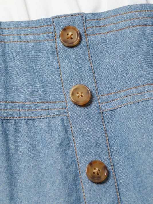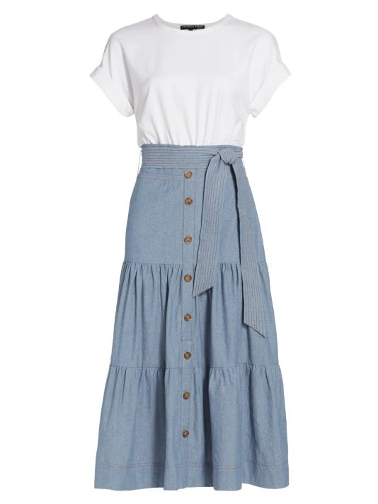 A classic T-shirt bodice is combined with a cool chambray skirt finished with a feminine flounce hem.