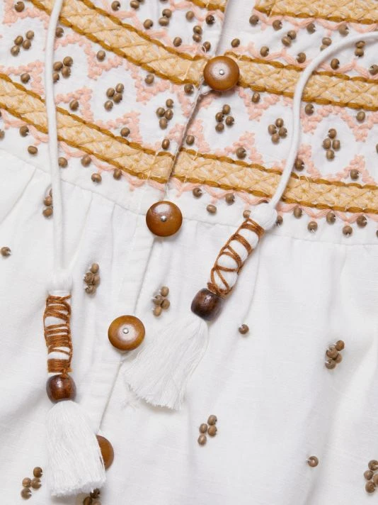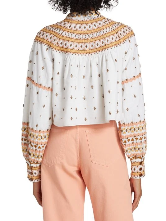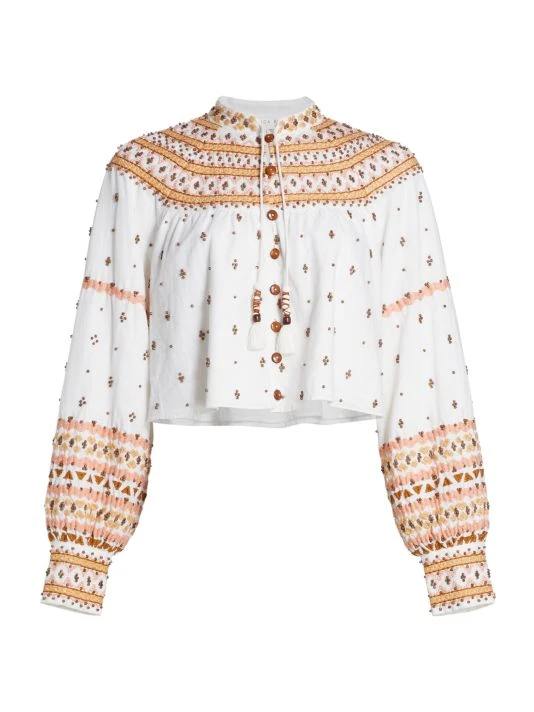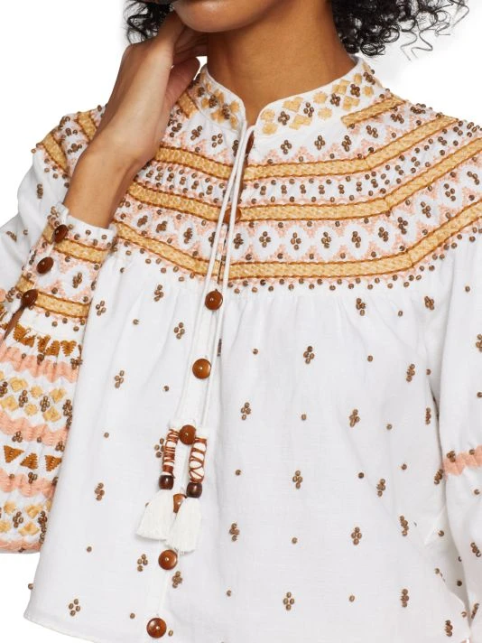 Highlighted with decorative embroidery, Veronica Beard’s Fernanda jacket flaunts voluminous billowy sleeves. This cropped piece features a stand collar adorned with beaded tassels.