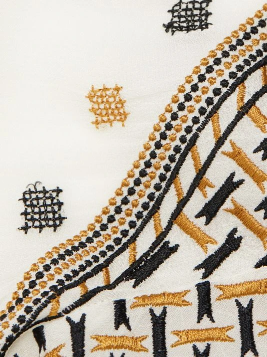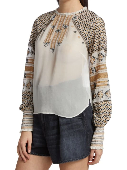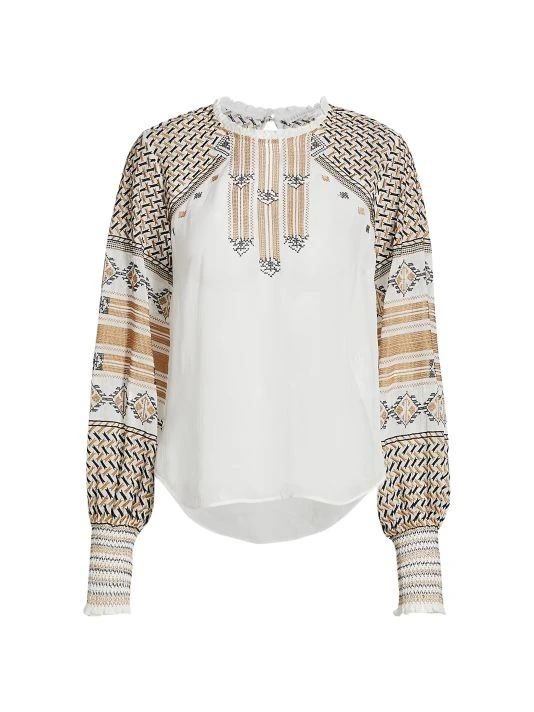 Designed with puff-sleeves and a ruffle collar, this blouse is decorated with geometric designs.