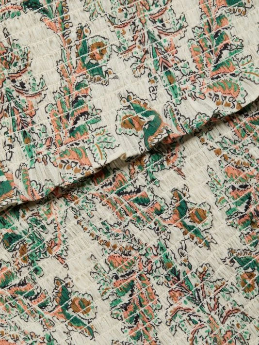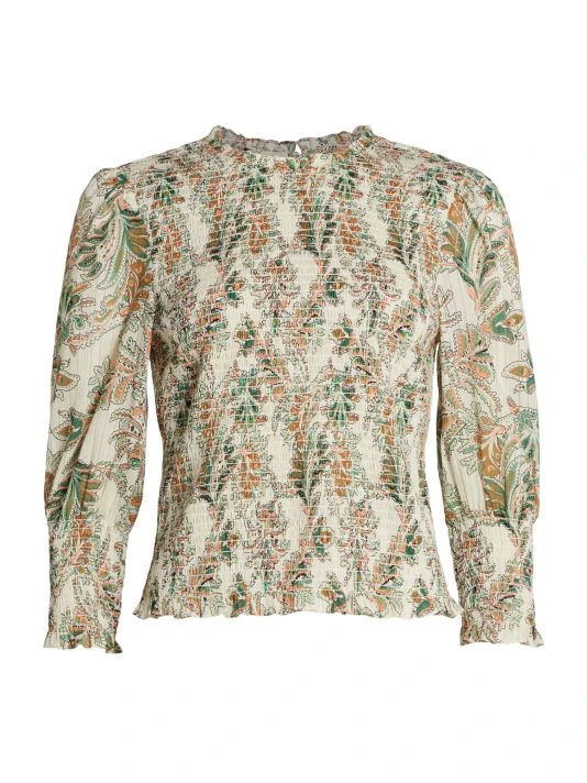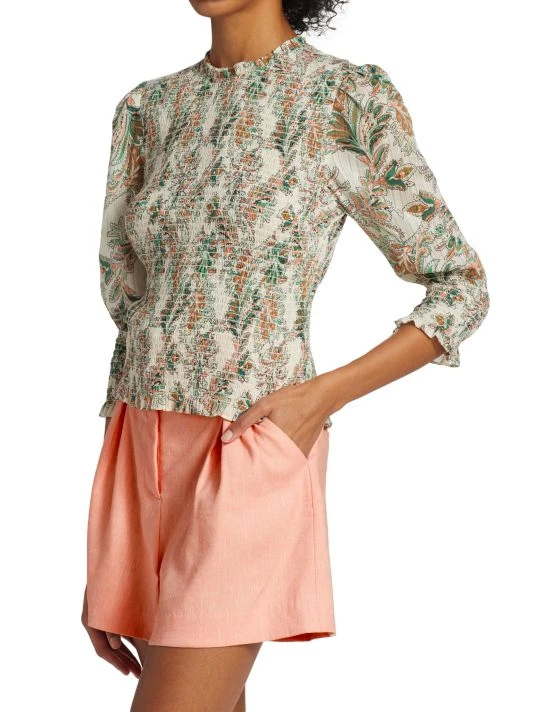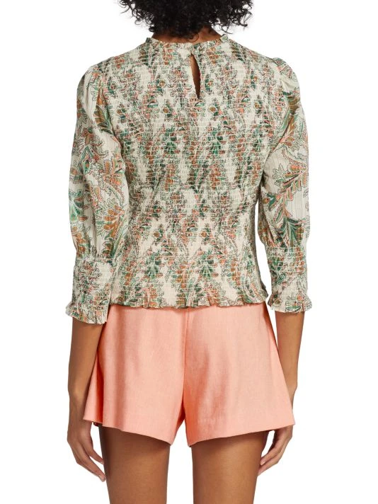 Flaunting slightly puffed sleeves, Veronica Beard’s Kali top has a smocked bodice for a flattering fit. The contemporary fashion label finishes this piece with a back keyhole.