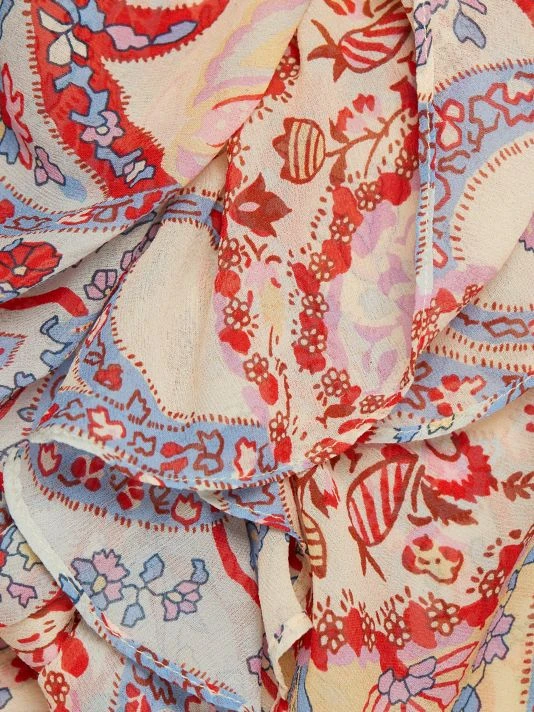 Crafted from printed sheer silk, this fitted high-waisted ankle skirt features a side-tie waist and a cascading ruffle detail.