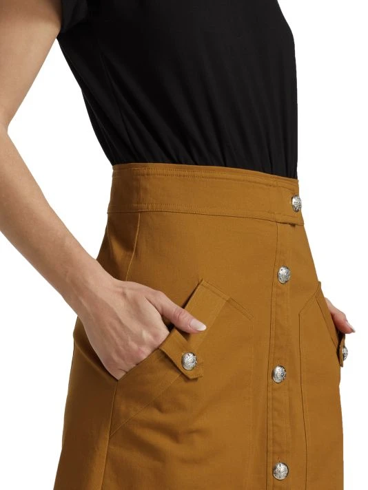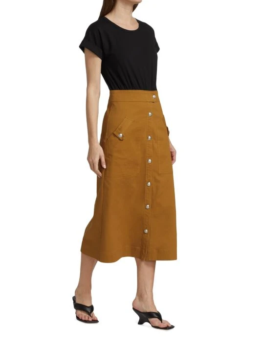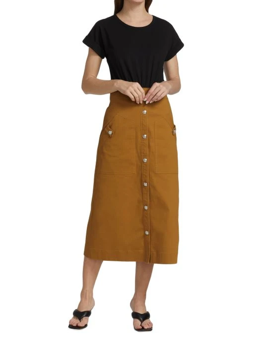 The Larsen midi-dress from Veronica Beard features a jewel-neck bodice with cuffed short sleeves. A contrast skirt with silvertone button details and rectangular patch pockets elevates this versatile look.