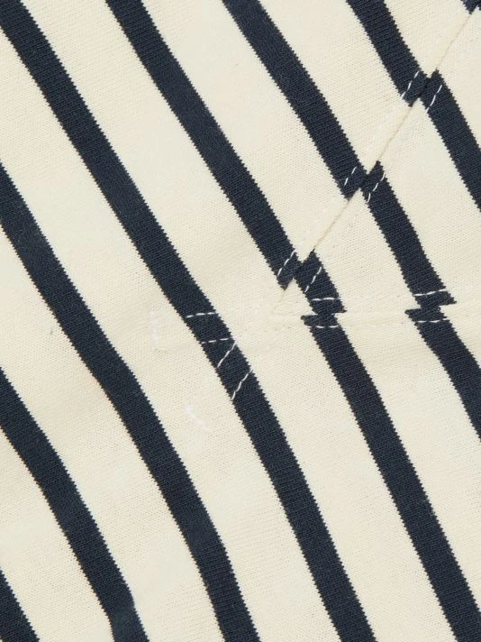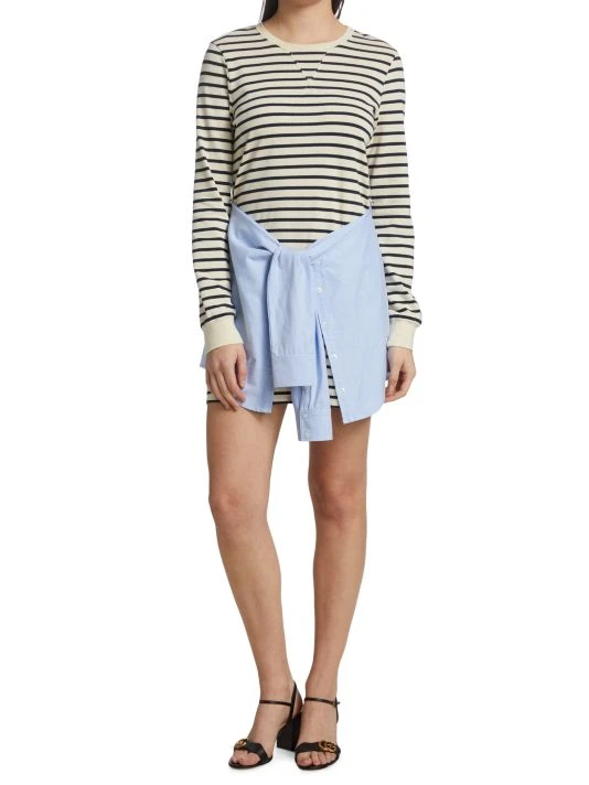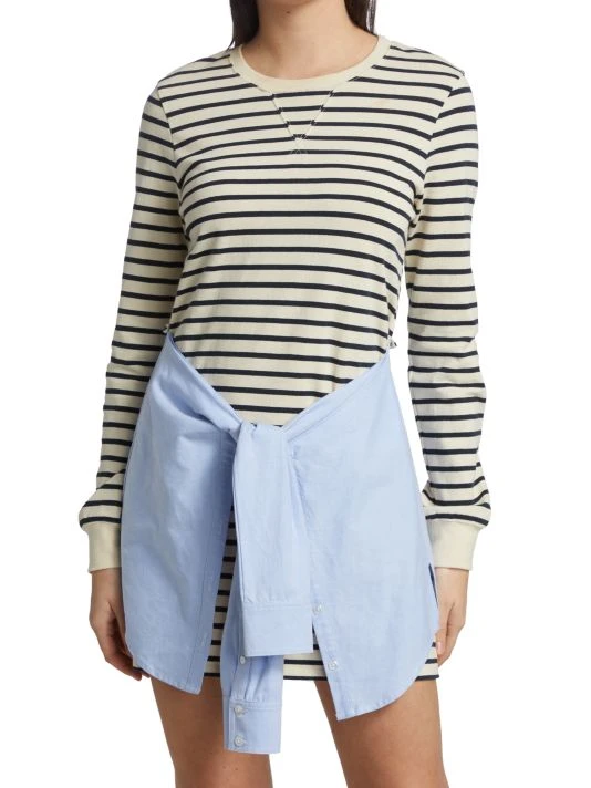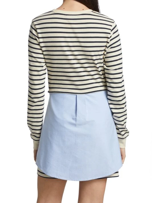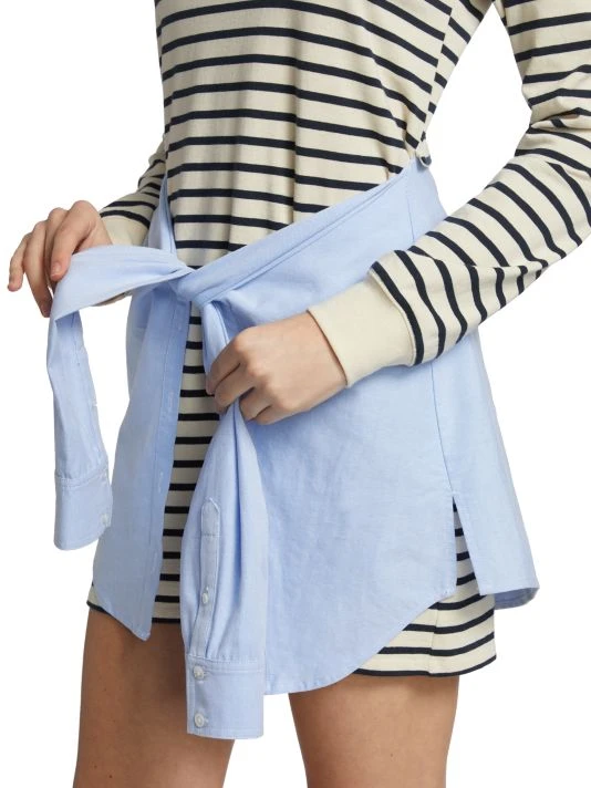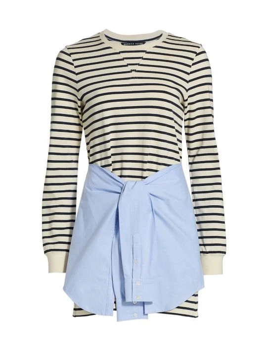 This T-shirt-style dress has a dark stripe pattern, adorned with a contrasting denim overlay inspired by a denim shirt wrapped around the waist.