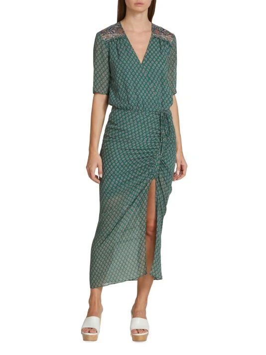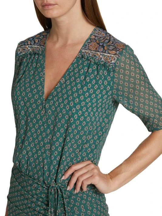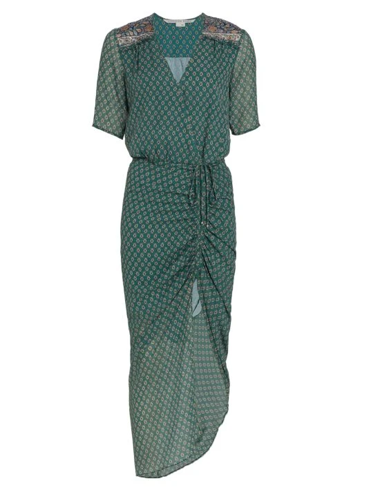 An intricate geometric print covers Veronica Beard’s silk Mariposa dress, designed with front ruching and partially sheer construction.