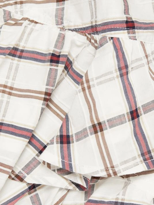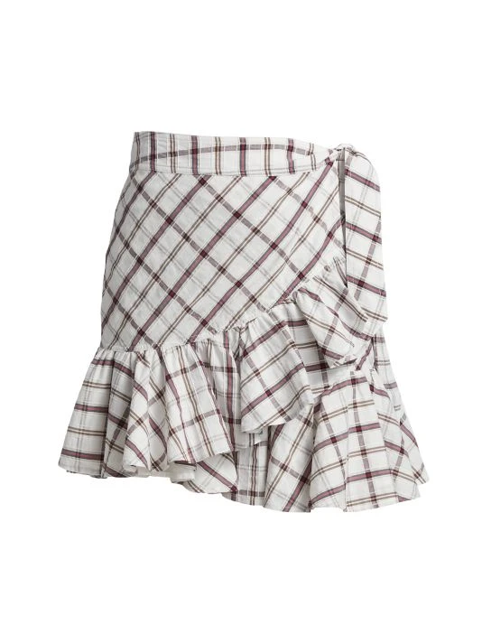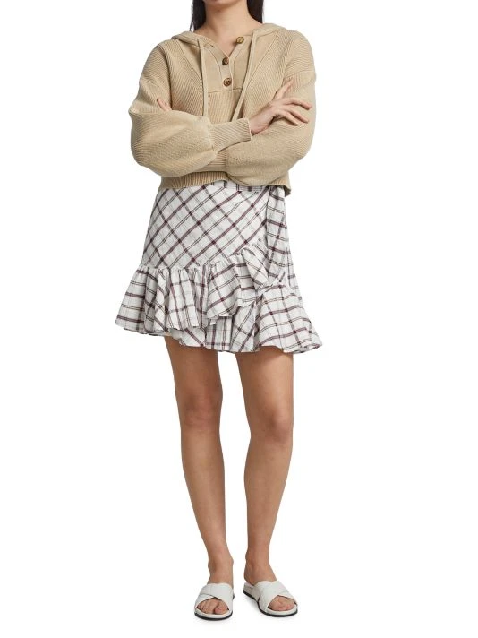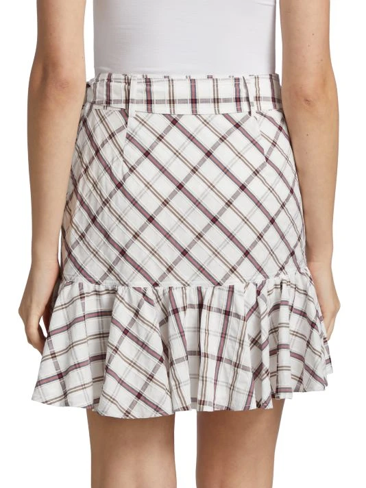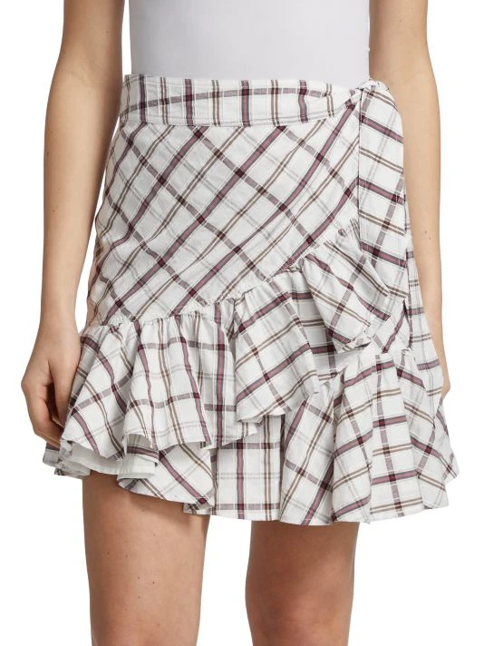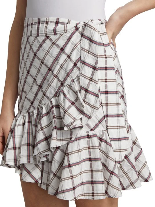This plaid cotton-blend miniskirt features a true wrap-front closure with a tie-waist and a flirty ruffle hem.