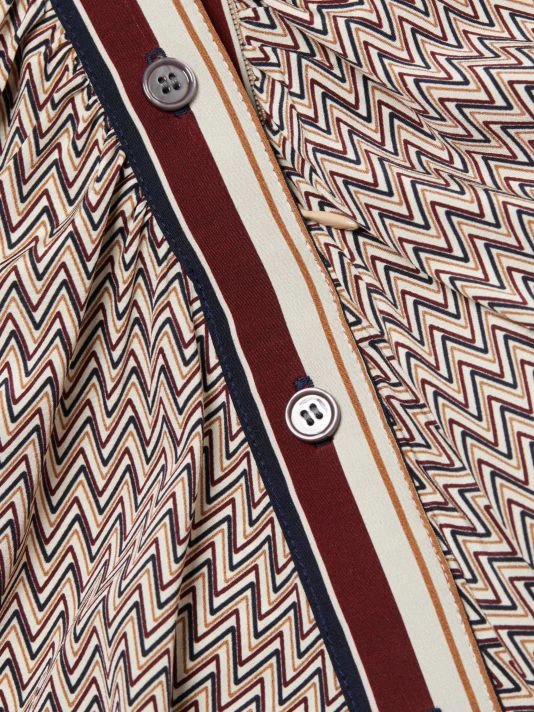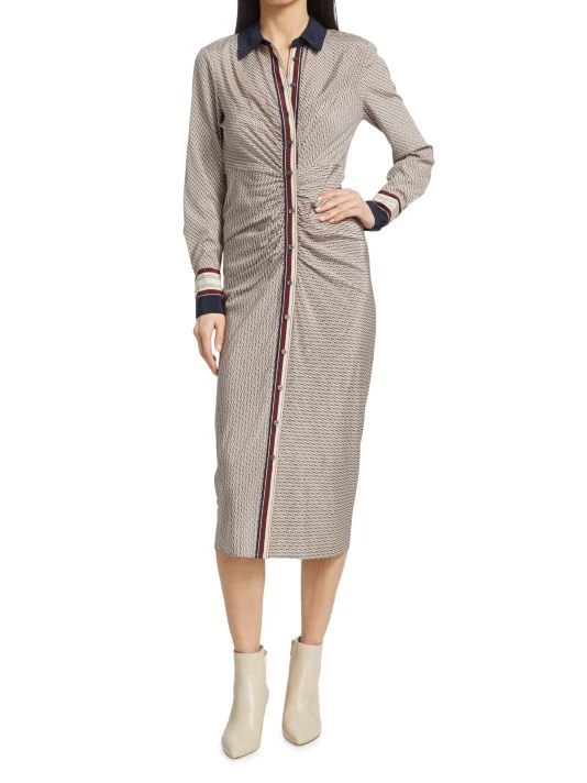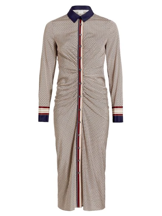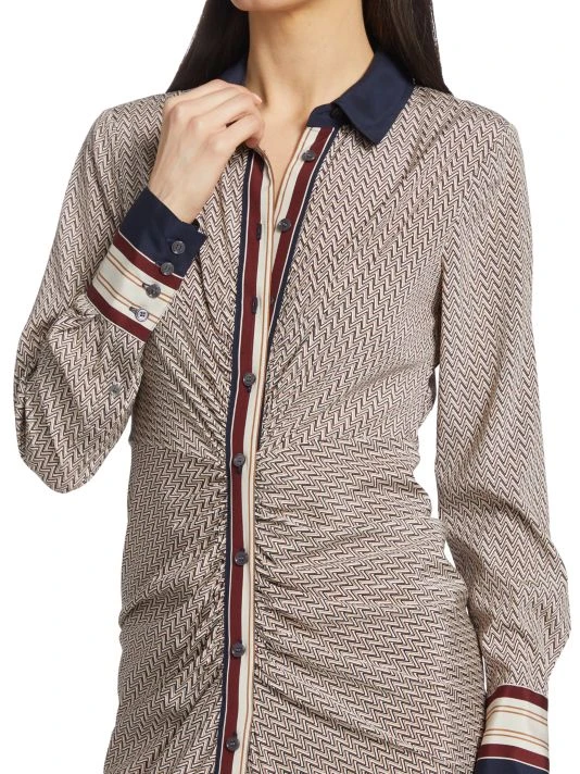 Veronica Beard’s Mesika printed shirtdress is crafted of a silk blend. Featuring contrast trim, this printed style is detailed with a point collar, long sleeves, and a ruched button placket at the front.