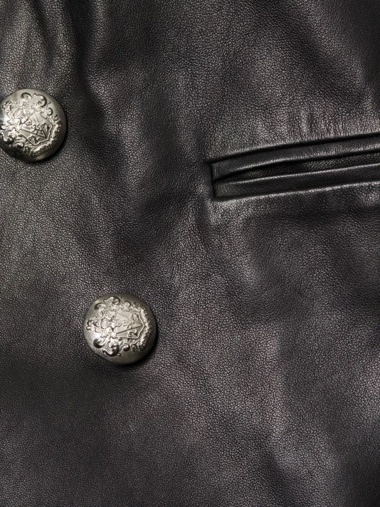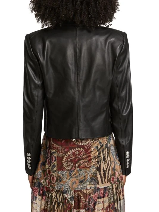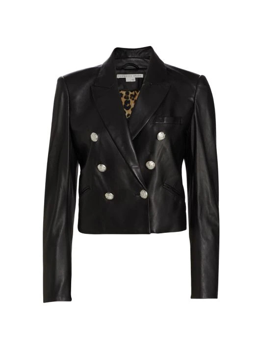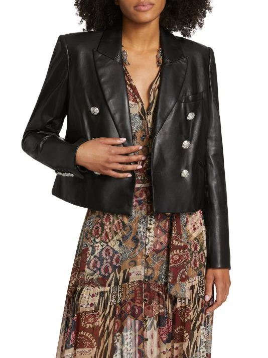 Luxe lambskin elevates Veronica Beard’s Nevis jacket, tailored to a sophisticated double-breasted silhouette.