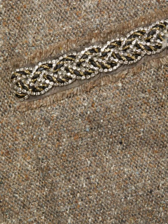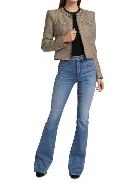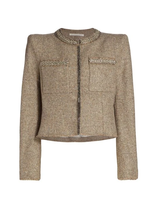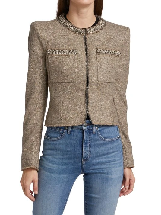 This chic wool-blend jacket features a strong shoulder and embellished trims in a fitted silhouette.