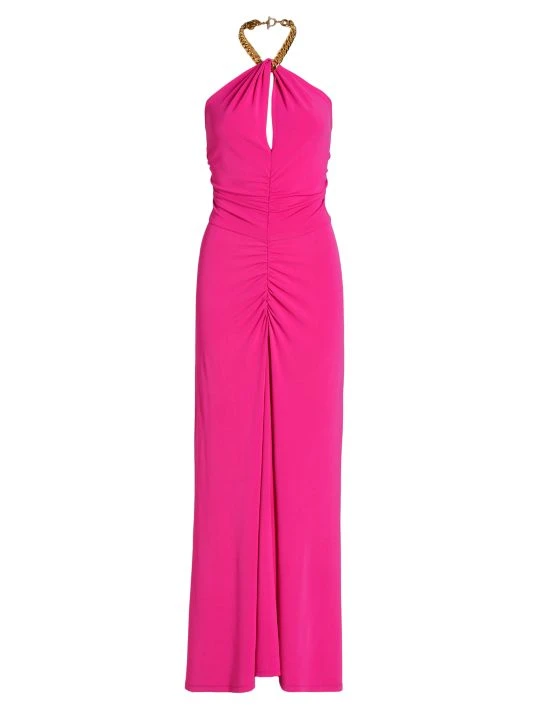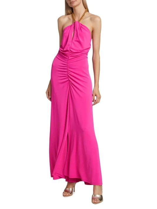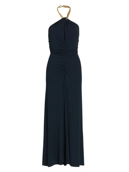 The Reze dress from Veronica Beard is a ruched style with a chunky chain-link halterneck.