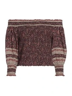 Smocked off-the-shoulder top in a cropped silhouette with mixed abstract print.