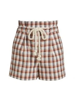 Check shorts with a high-rise waist featuring a woven rope tie.