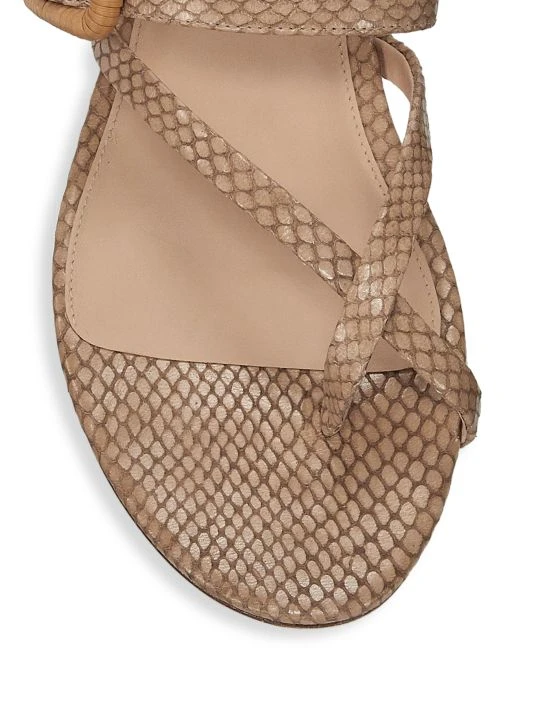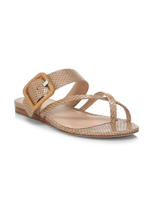 A snake-print finish and raffia buckle add textural interest to these summer-ready flat leather sandals.