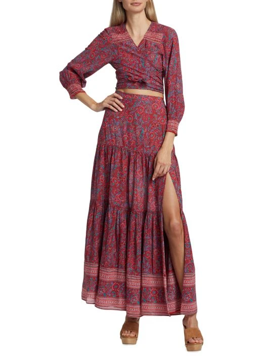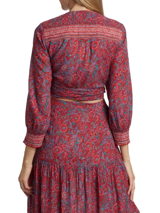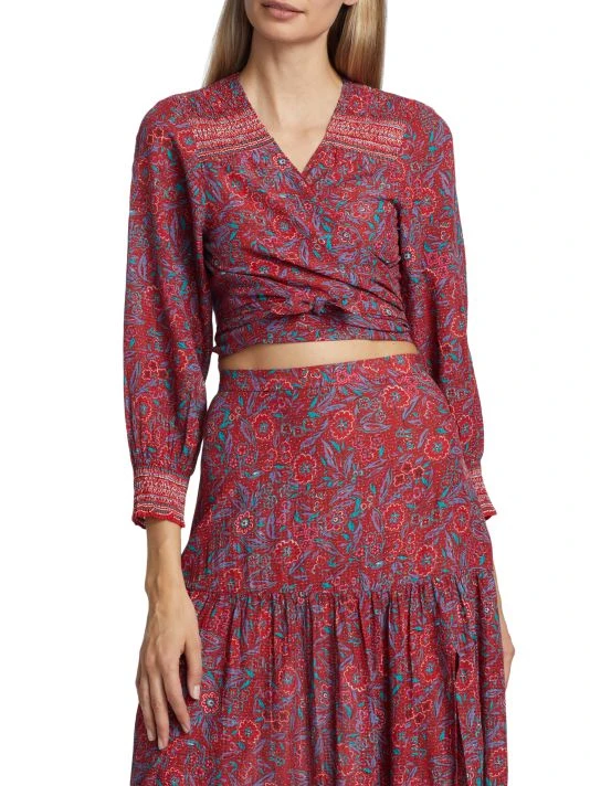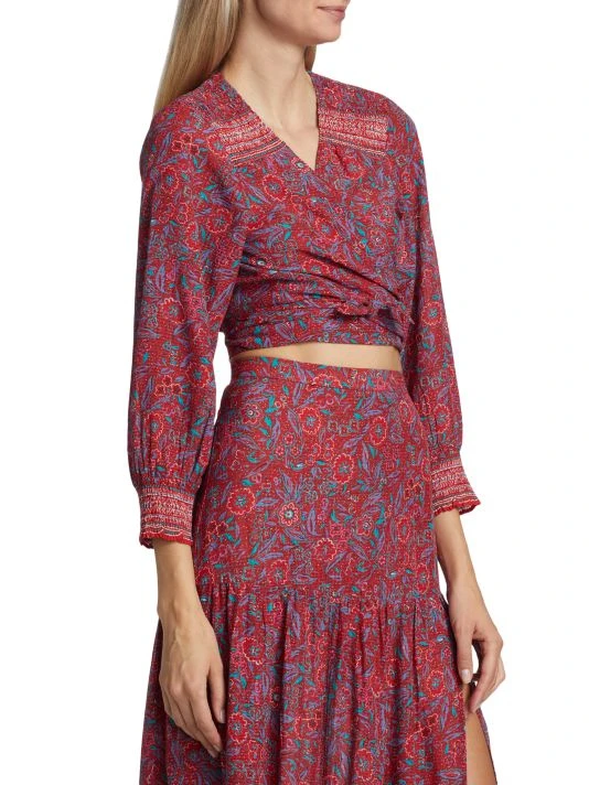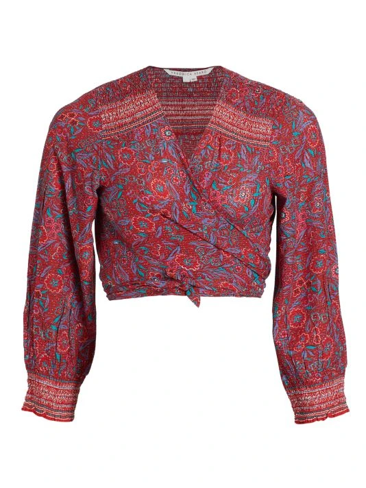 This charming wrap top blooms with a bright floral print, set at cropped length for an added boho touch.