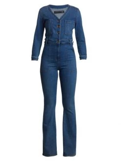 This fitted denim jumpsuit skims the figure, featuring patch pockets at the chest.