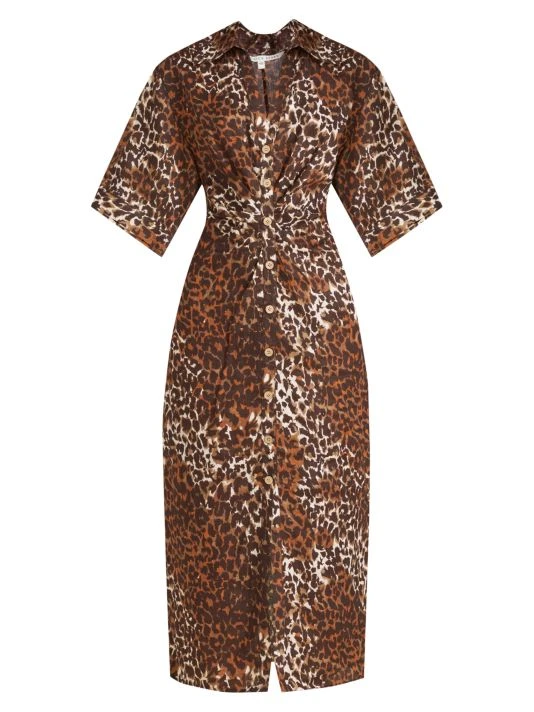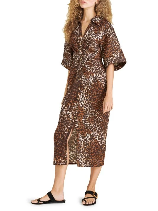 Tailored and ruched detailing shapes this bold printed linen dress.
