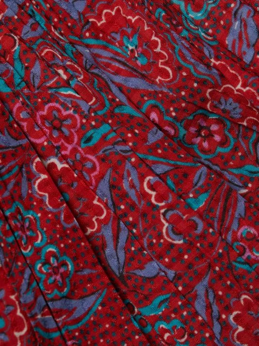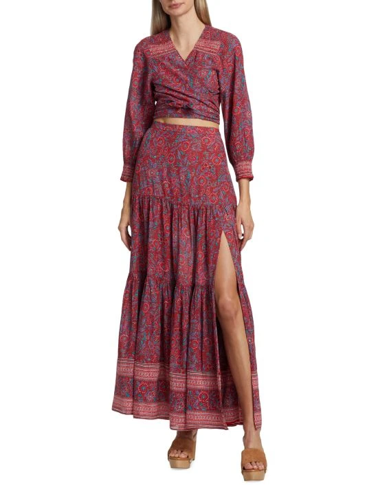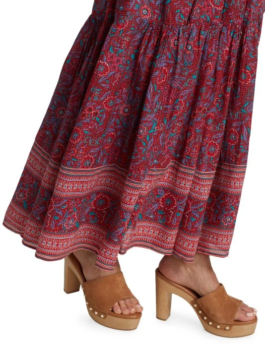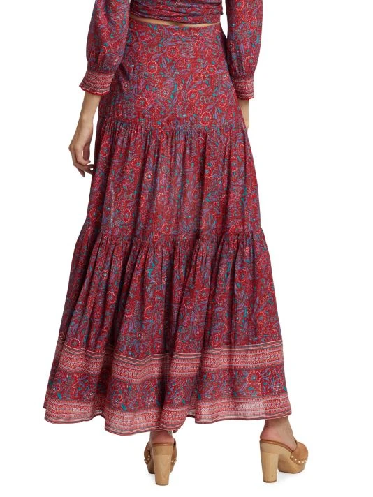 This charming midi-skirt flows from the banded waist into a tiered design, adorned with compact floral print.