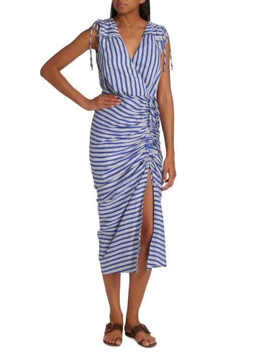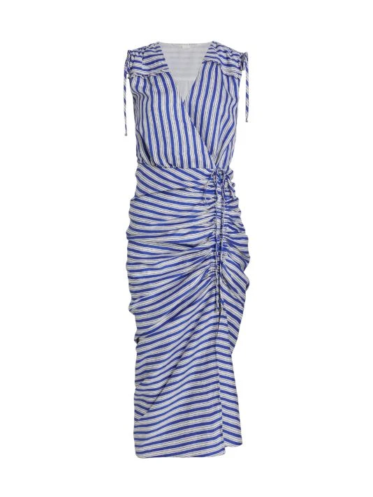 Veronica Beard’s Teagan dress is adorned with stripes in a ruched wrap style.