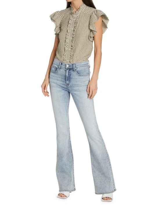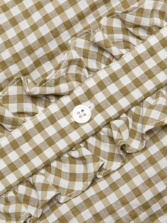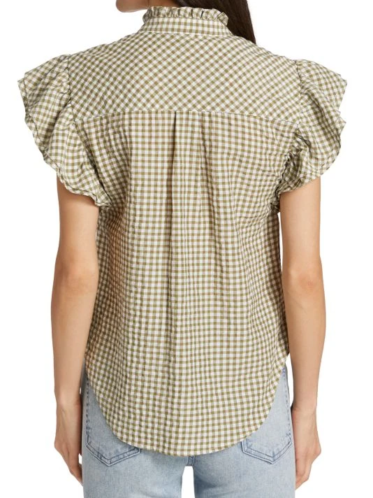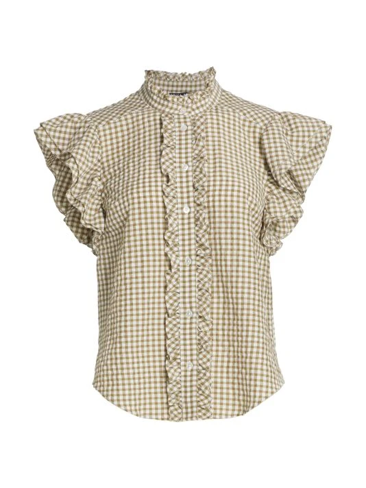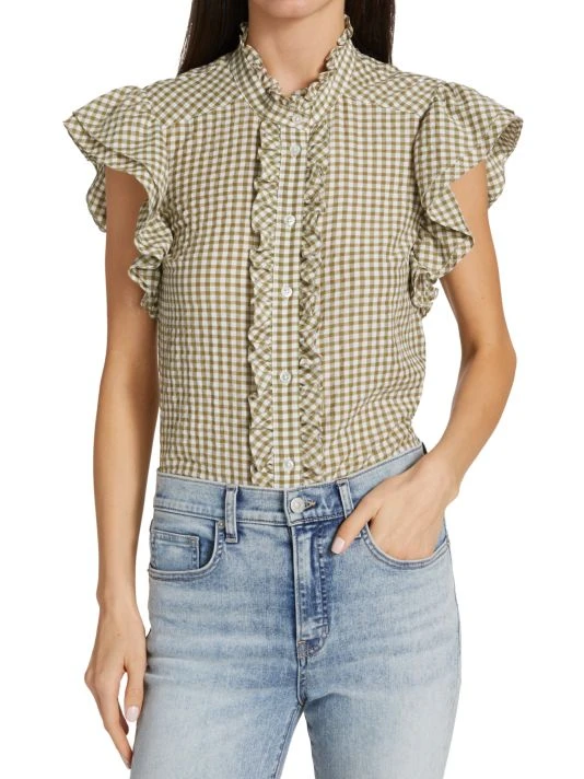Decored with a gingham print, Veronica Beard’s Tenille cotton-blend shirt is detailed with a stand collar, cap sleeves, and button front trimmed with ruffles.