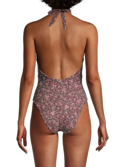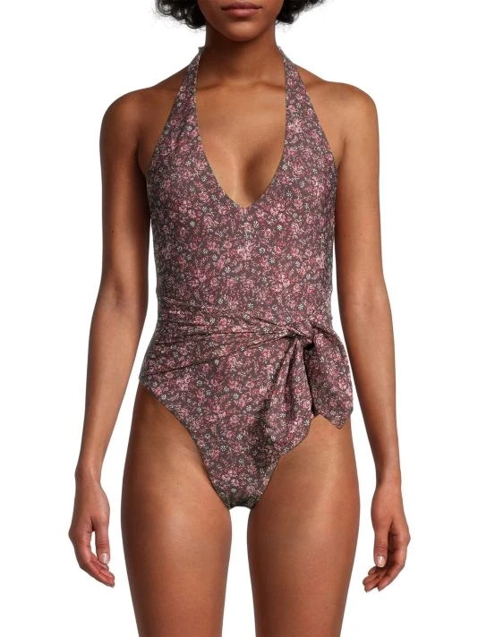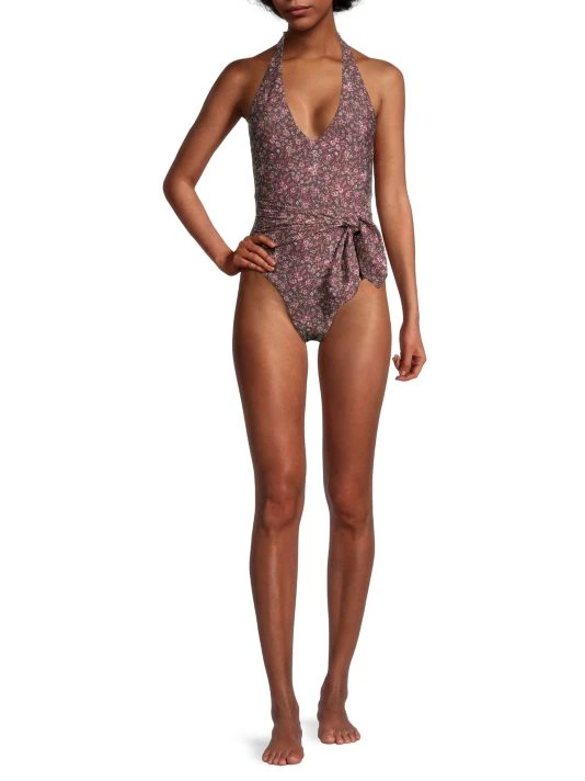 Tonal florals cover this streamlined one-piece swimsuit, designed with a self-tie to define the waist.