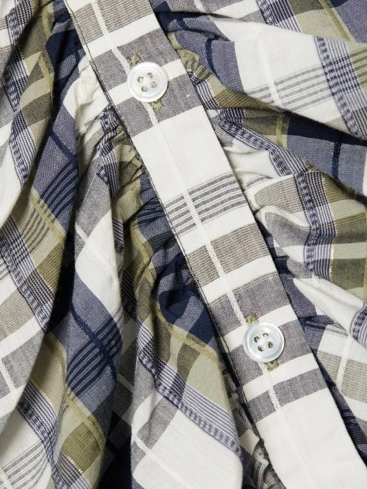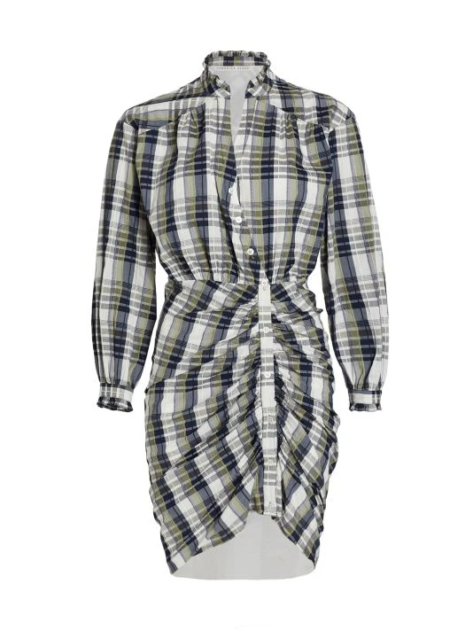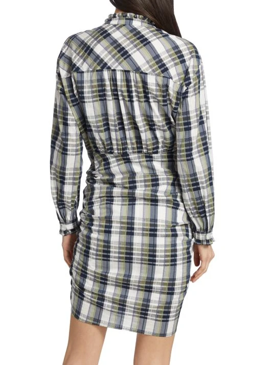 Veronica Beard’s Vilette shirtdress is crafted of a cotton blend. Decorated with a plaid pattern, this mini-length style is detailed with a surplice neck, long sleeves, and a ruched skirt.