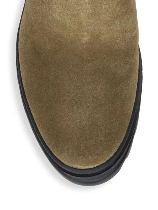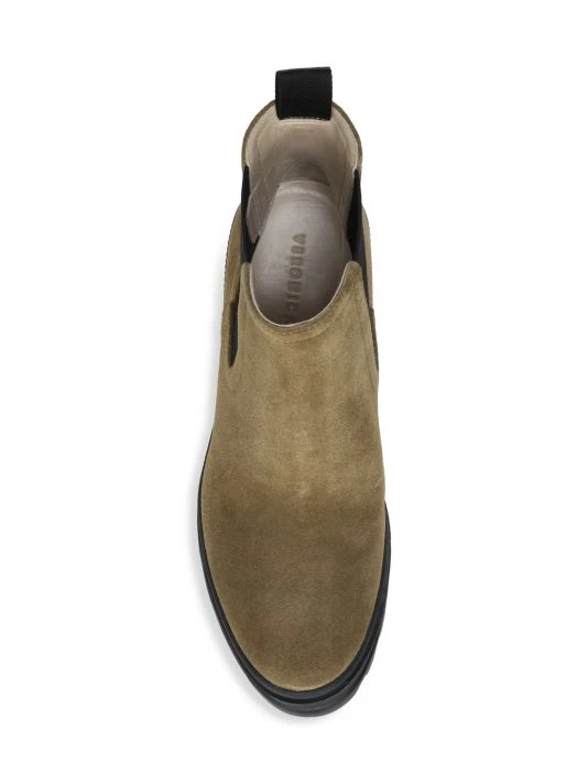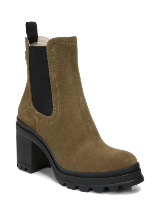 Water-repellent suede ankle boots with sleek side elastic gores and chunky lug soles.