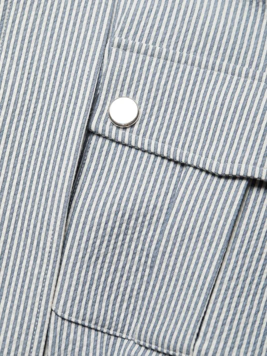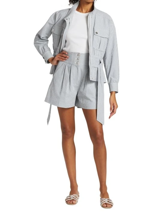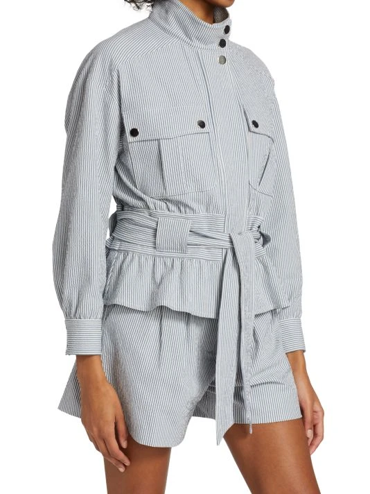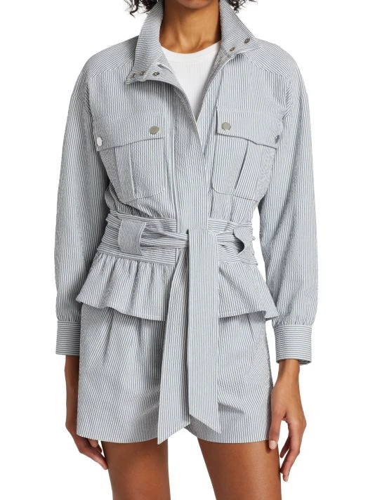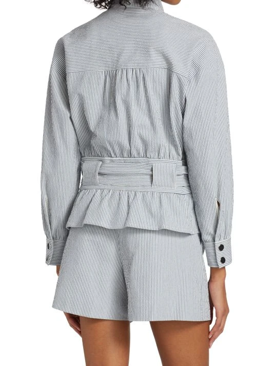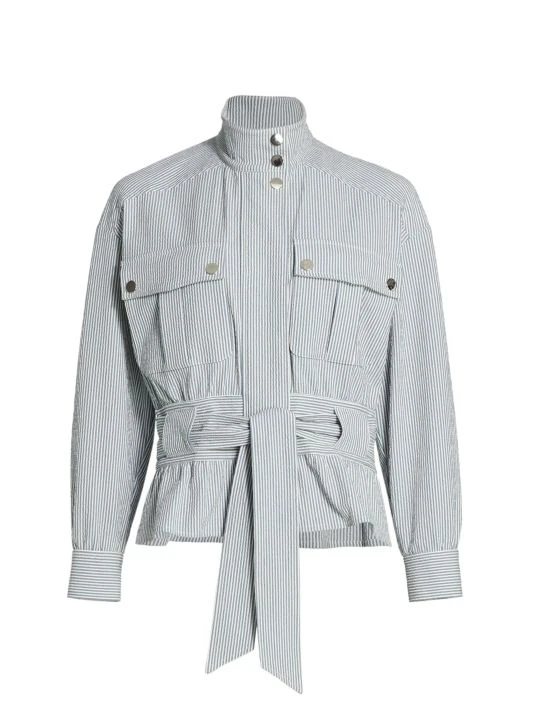 Crafted of seersucker, this belted jacket is complete with two-tone striping and silvertone snap-button closures.