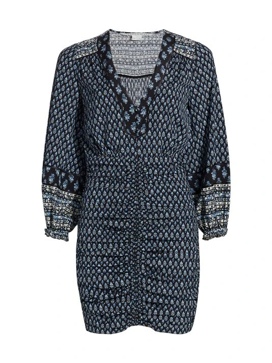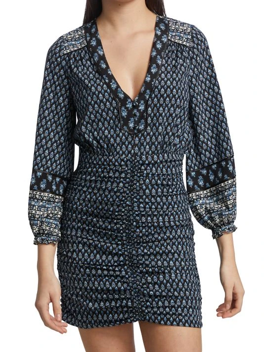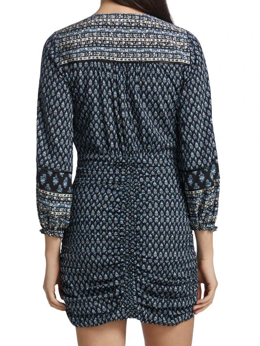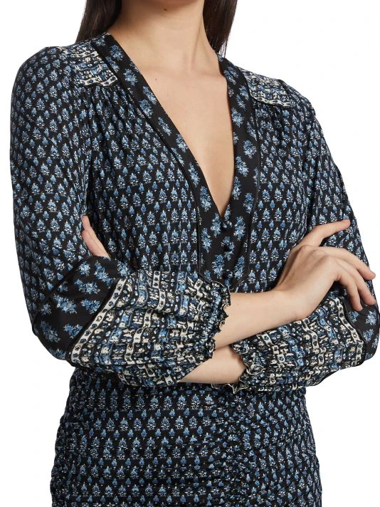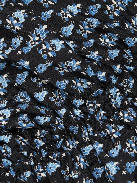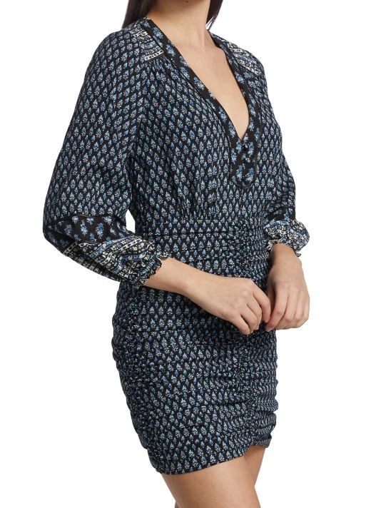 This fitted minidress is crafted of ruched stretch-silk with a floral print.